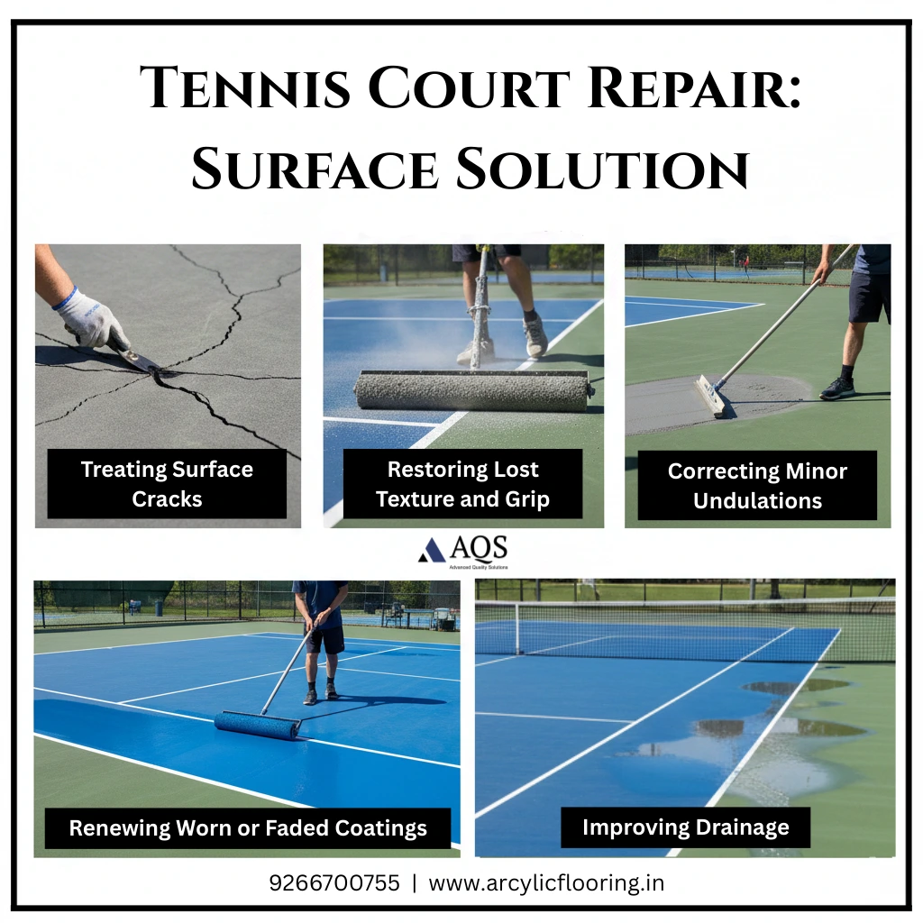 AQS (Advanced Quality Solutions) is a company that specialises in manufacturing and providing solutions for high-end sports flooring made from synthetic acrylic. They offer a range of products specifically designed for repairing and resurfacing tennis courts.